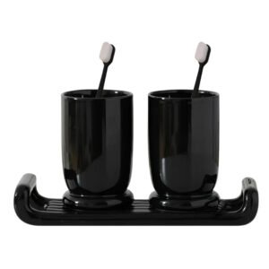 - Glossy Black Handle Tray with Glossy Black Toothbrush Holder + Round Ring Cup