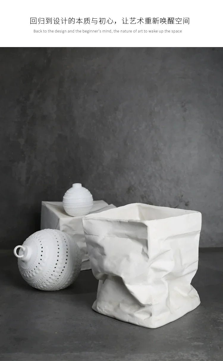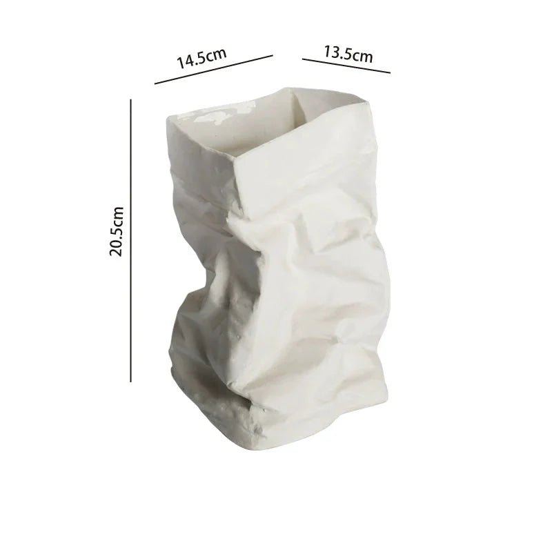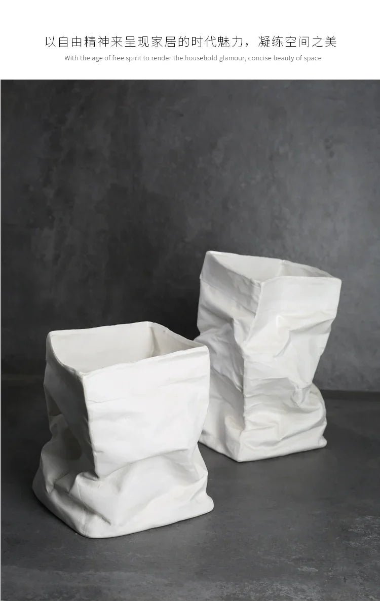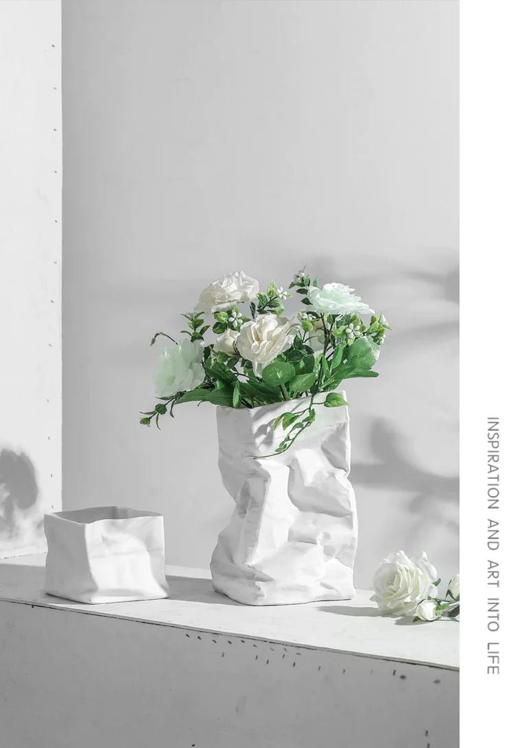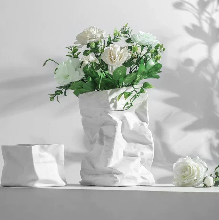 Transform your living space with the exquisite LENYVASEN Damian Fold-Bag Ceramic Flower Vase. This stunning piece of art not only serves as a functional vase but also stands as a testament to modern Nordic style design, making it a perfect addition to any contemporary setting. Crafted from high-quality ceramic, this vase showcases a unique fold-bag shape, resembling a paper bag while being durable and sturdy.